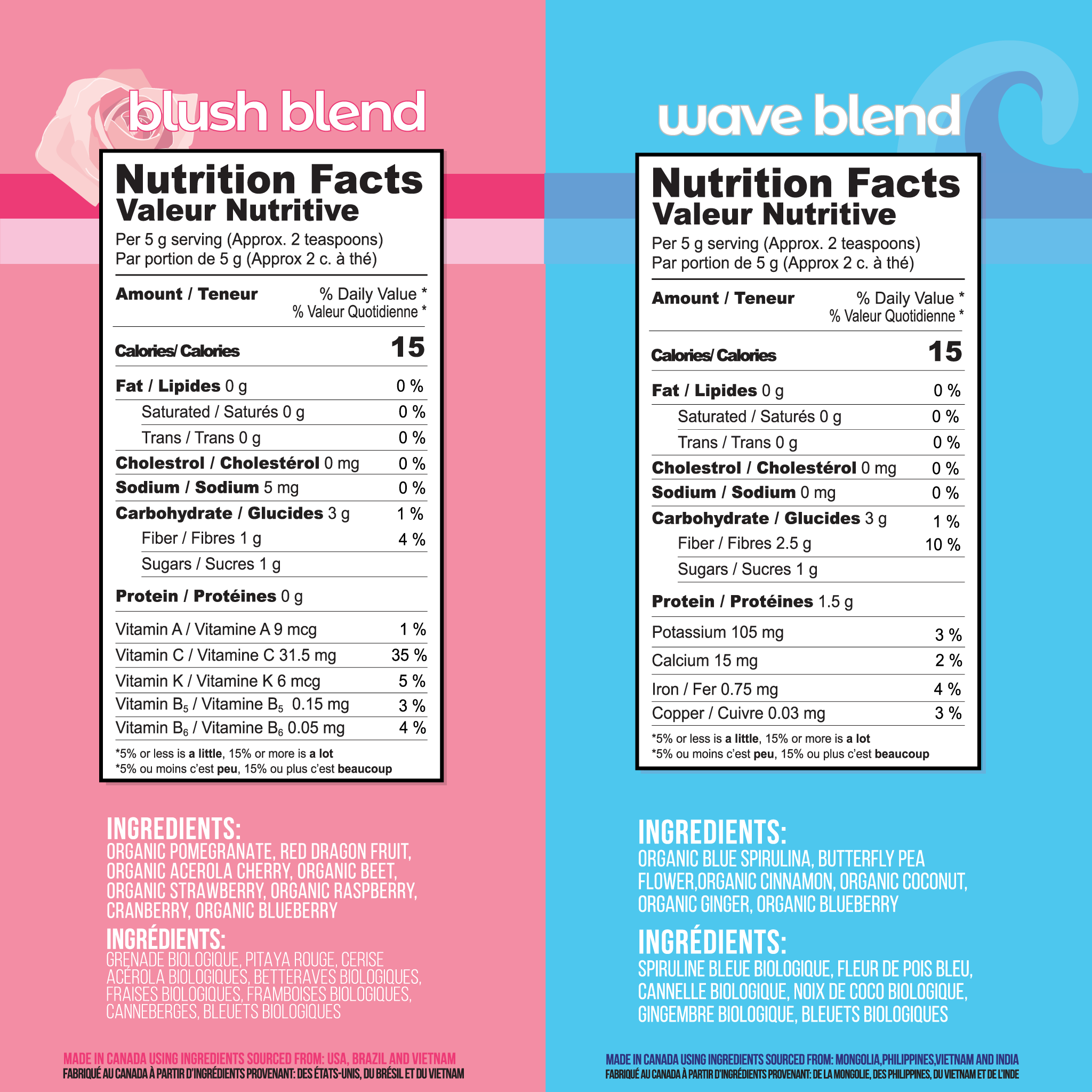 Our blush blend is made using 8 superfoods packed with nutrients and antioxidants to help with growth, development and repair of all body tissue while our wave blend is made using 6 superfoods full of micronutrients, antioxidants and fiber to enhance energy levels, immunity and digestion.